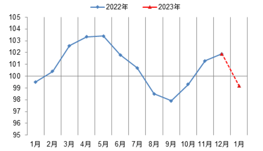 2023年1月份,受疫情和春节假日因素影响,化工下游需求收缩,综合测得化工行业综合景气指数初值为99.2点,较12月份下降2.6点。2022-2023年中国化工行业景气指数走势见图1。