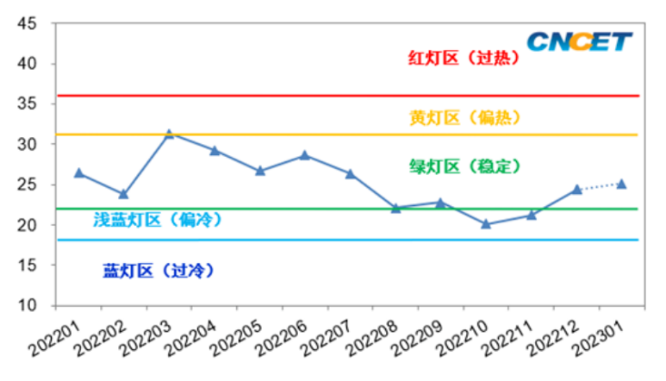 受国际原油连续两个月走弱影响,利好石油加工业景气度修复,测算到1月份化工综合预警指数初值为25.1,较12月份上涨0.6点。最近12个月中国化工行业综合预警指数具体走势见下图。
